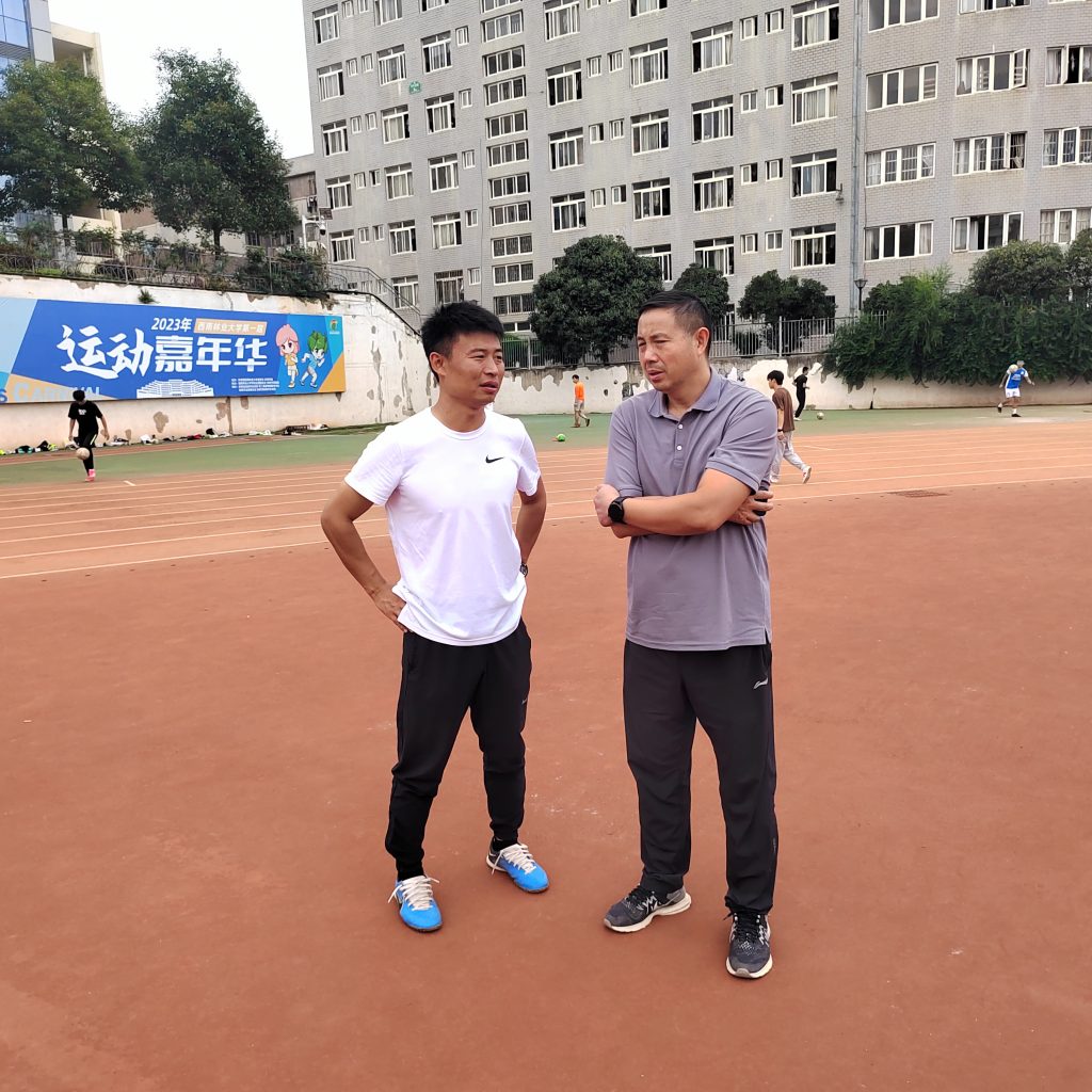 郭荣经理与各任课教师进行交流,了解体育教育专业员工的身体素质、专项技能水平、教学场地和器材及教学安全的预防措施。郭荣经理在检查中提出,各位任课教师要熟练掌握中学体育教育的相关文件要求,将教学重点放在全面提升员工的专业能力和执教能力上;在与员工交流中了解员工的学习状态,着重强调要掌握运动技术练习方法,做到讲解条理,重点突出,示范完整准确。