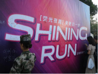 2019年4月12日晚八点,平日里寥若晨星的田径场却热闹非凡,人们大多头戴发光牛角亦或是蝴蝶结,正随着音乐摇摆,欢笑声、尖叫声、音乐声环绕着整个田径场。而在田径场入口的跑道上,立着一扇灯光闪烁的巨门,上面印着“VIVO荧光夜跑”几个大字!